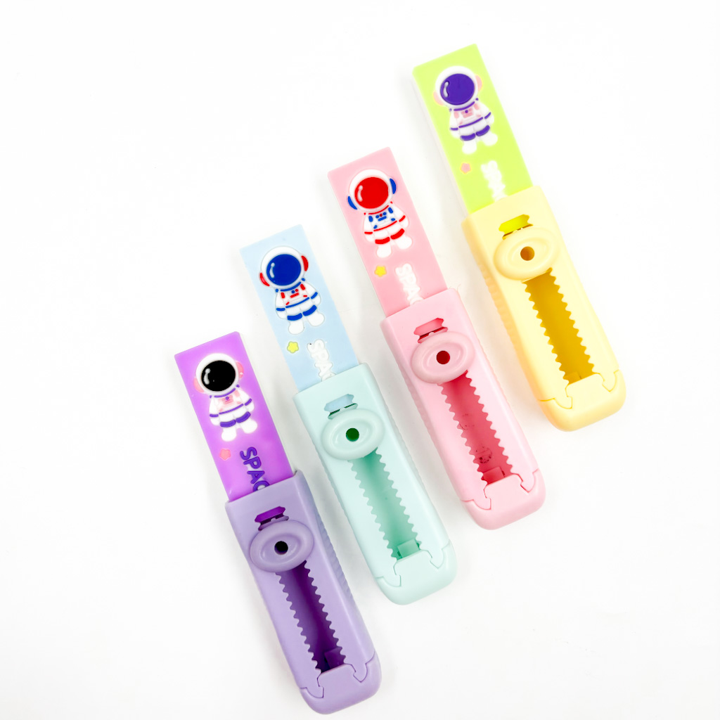 Borrachas em formato de estilete possuem um manejo para borracha descer e ser prático no momento de apagar. São super práticas para serem carregadas no estojo. Além disso, são lindas e super detalhadas, com Cores diversas em tons pasteis: Lilás, Amarelo, Azul e Rosa