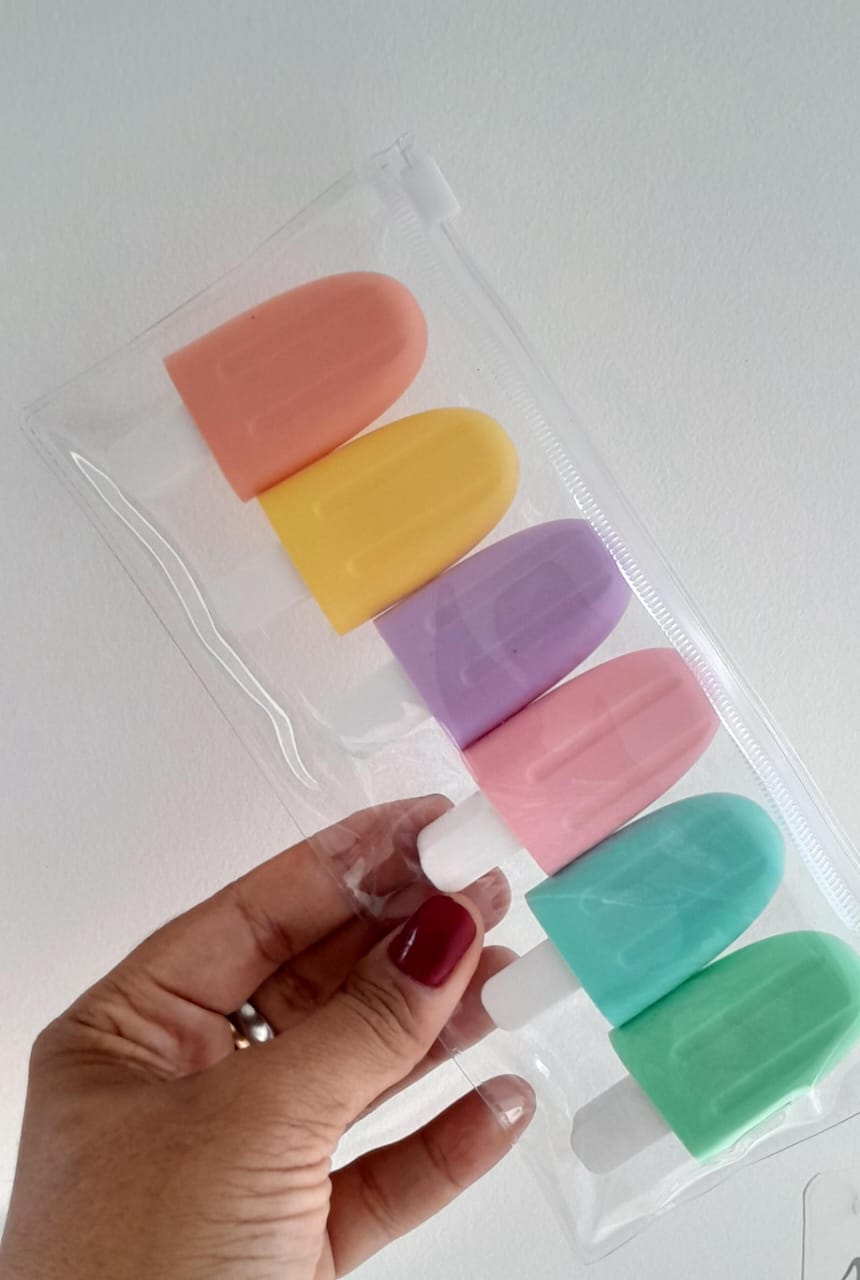 Cores: azul, amarelo, laranja, lilás, rosa e verde.