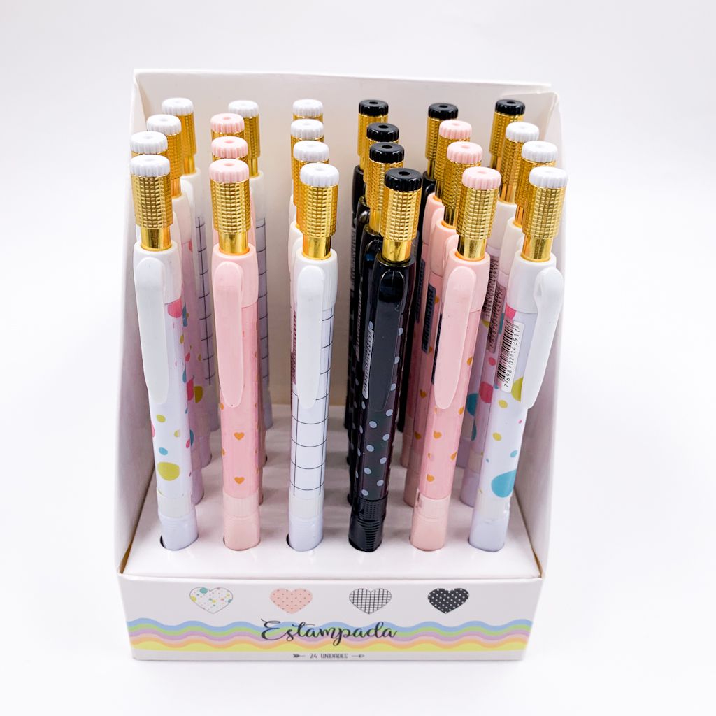 Lapiseiras estampadas em cores lindas. Fabricadas em material plástico resistente. Possui apontador na ponta e grip para pendurar. A pontinha em dourado é um charme e a grafite 2.0 mm é maravilhosa pra escrever. São 4 estampas diferentes.